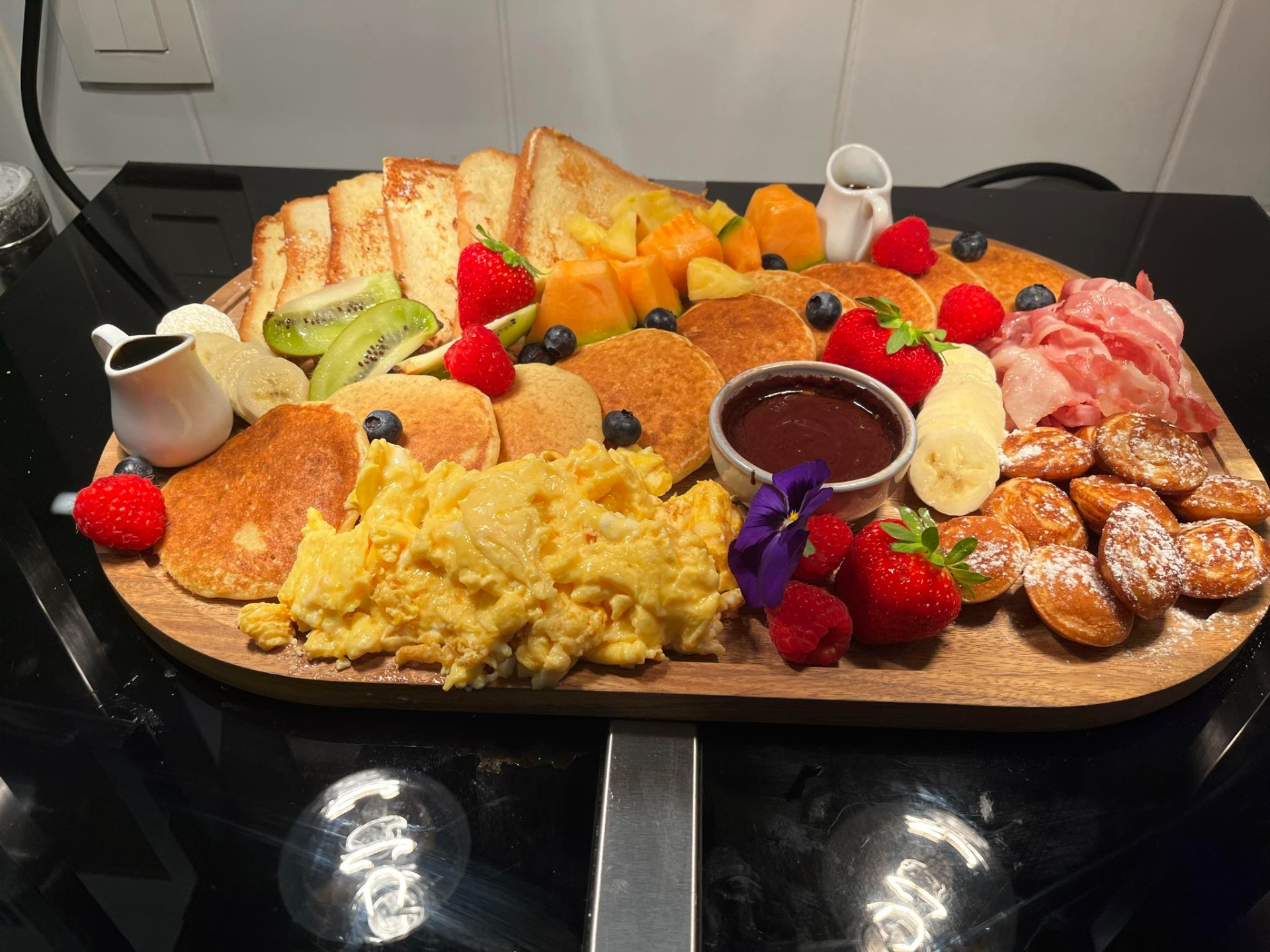 pancakes, poffertjes, wentelteefjes, fruit, chocoladesaus, ahornsiroop, spek en ei